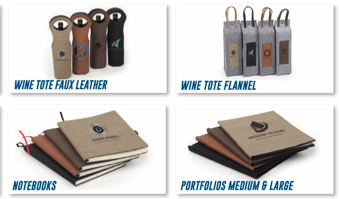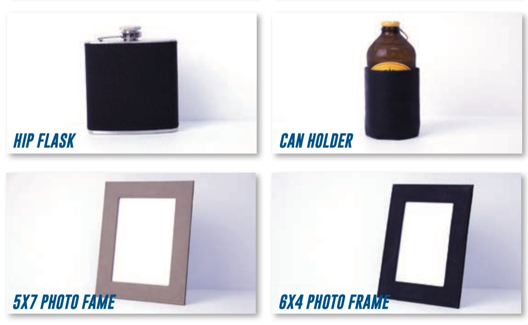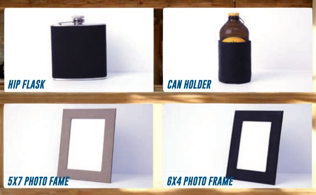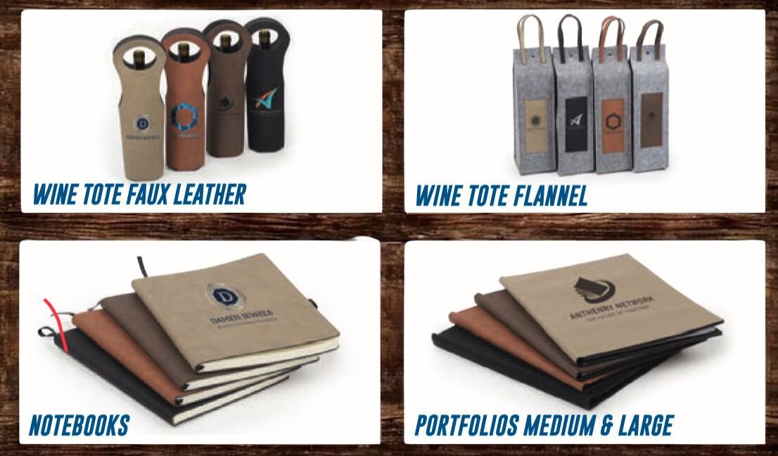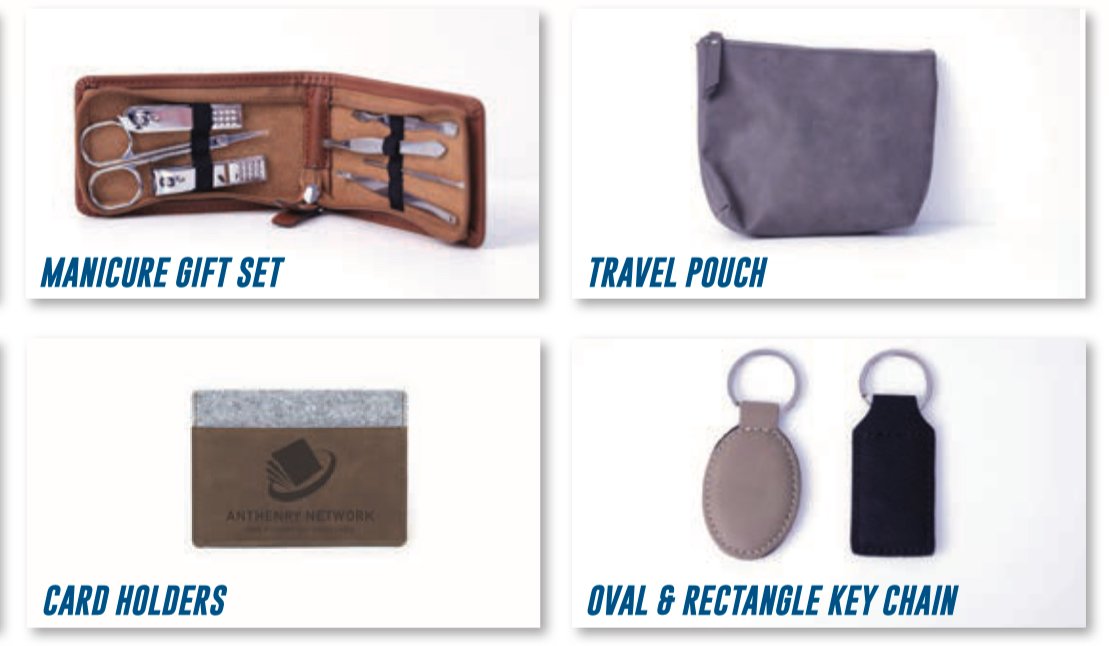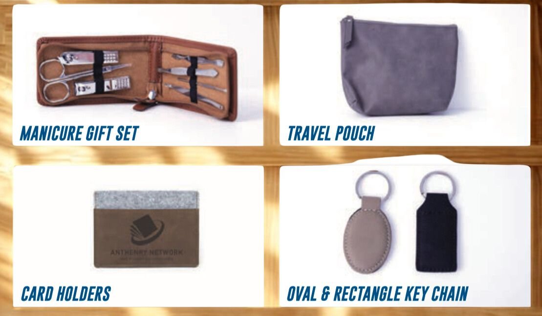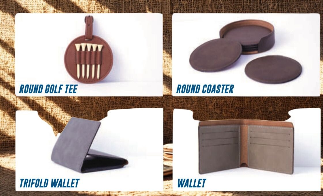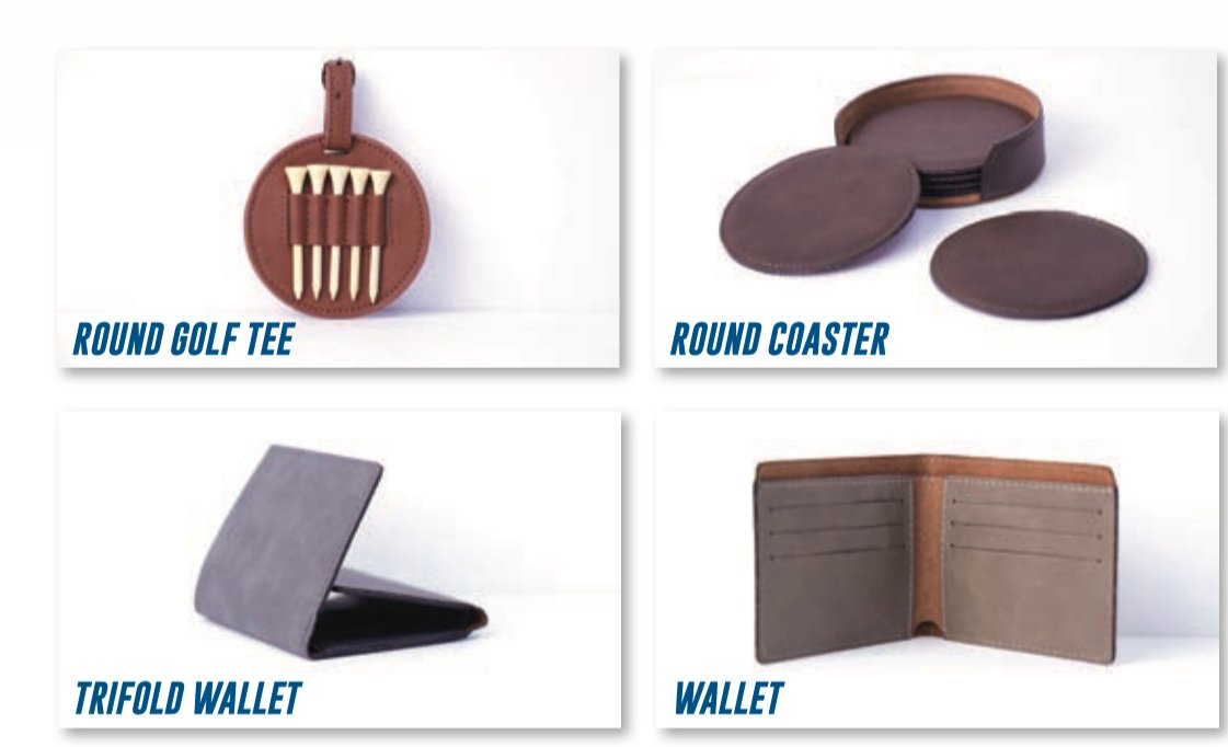 Can Holder, Hip Flask 6 Oz, Manicure Gift Set, Notebook, Oval Key Chain, Photo Frame 4” X 6”, Photo Frame 5” X 7” , Portfolio Medium , Portfolio Large, Rectangle Key Chain, Round Coaster 6 Set, Round Golf Tee, Travel Pouch, Trifold Wallet, Wallet, Wine Tote Flannel, Wine Tote Faux Leather, Card Holder.